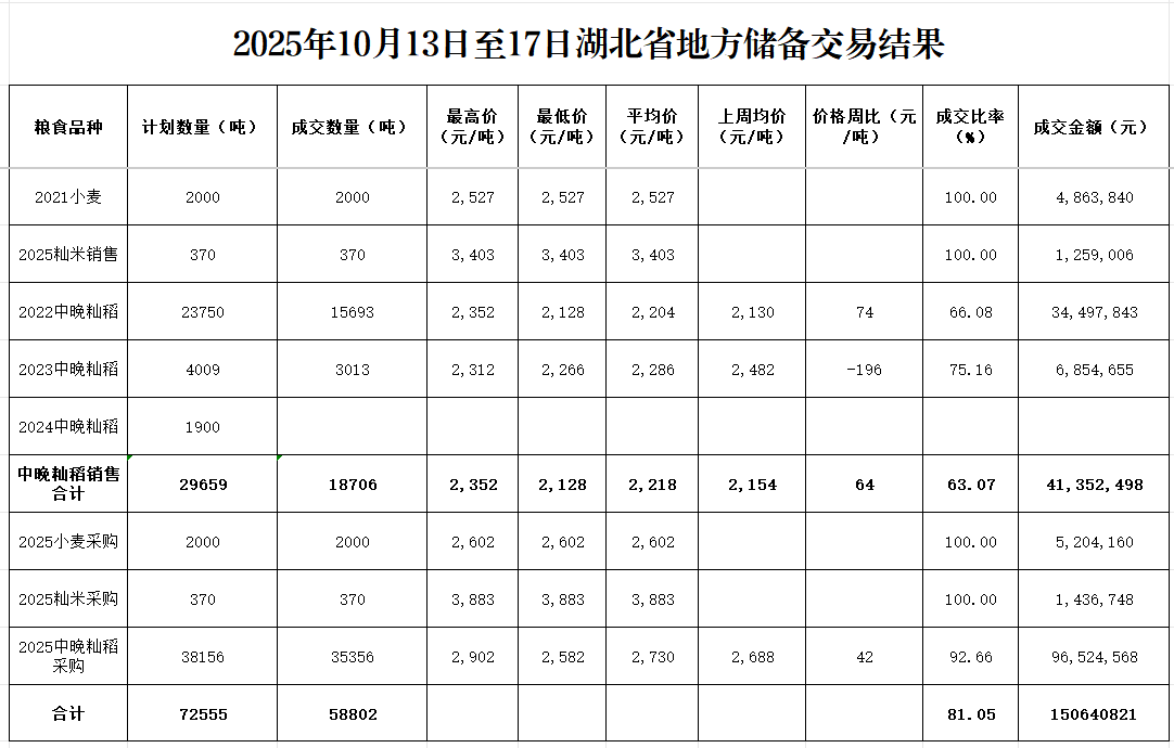 本周(2025年10131017日)湖北无国家政策性粮食投放。
